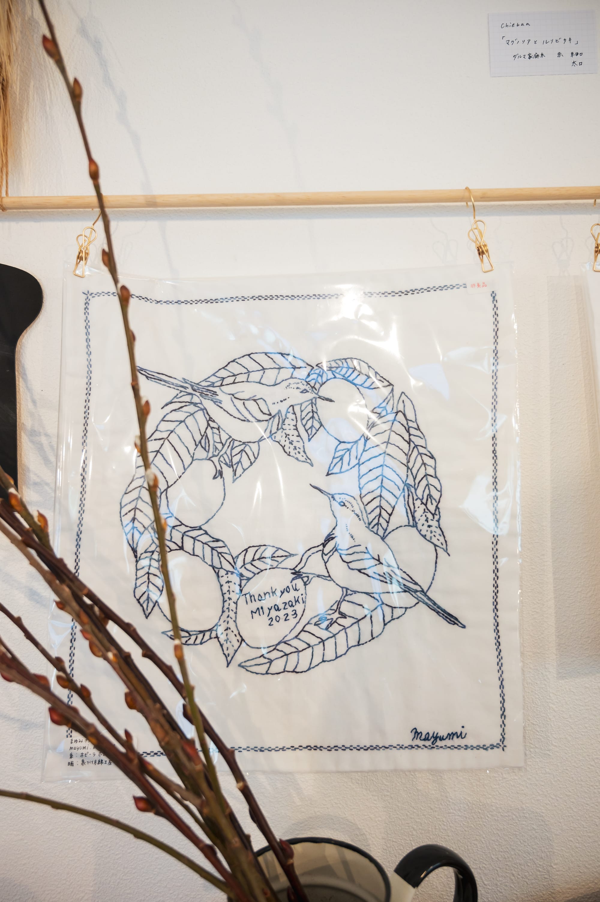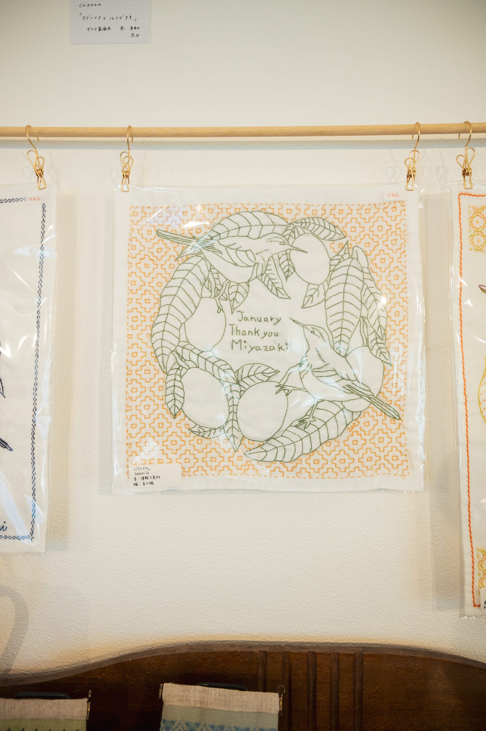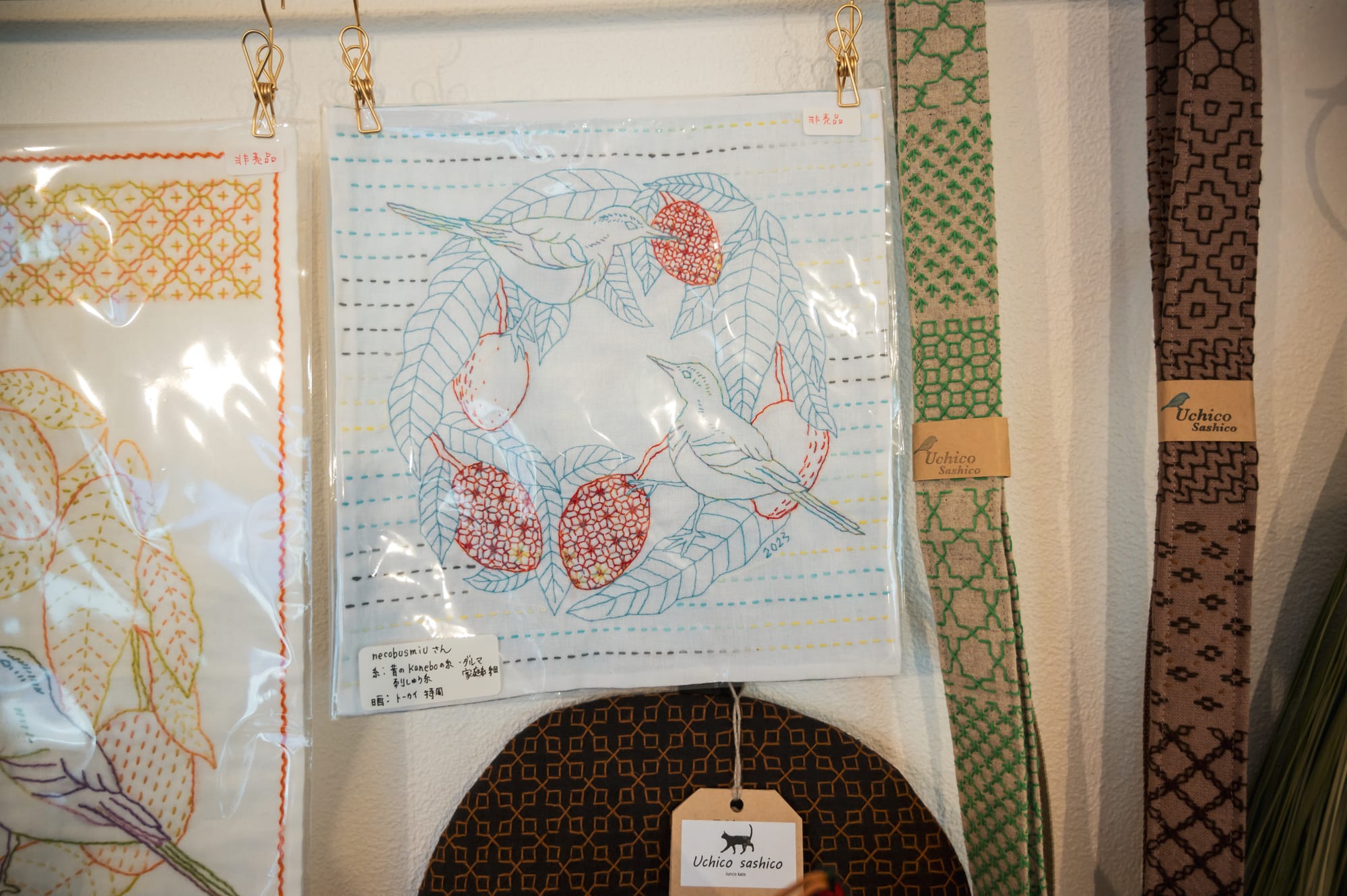 These pieces were stitched by various artisans for the lovely annual sashiko and kogin exhibition at Oomae Nunoten in 2023. The bird motif was generously designed and gifted by Chiebaa.